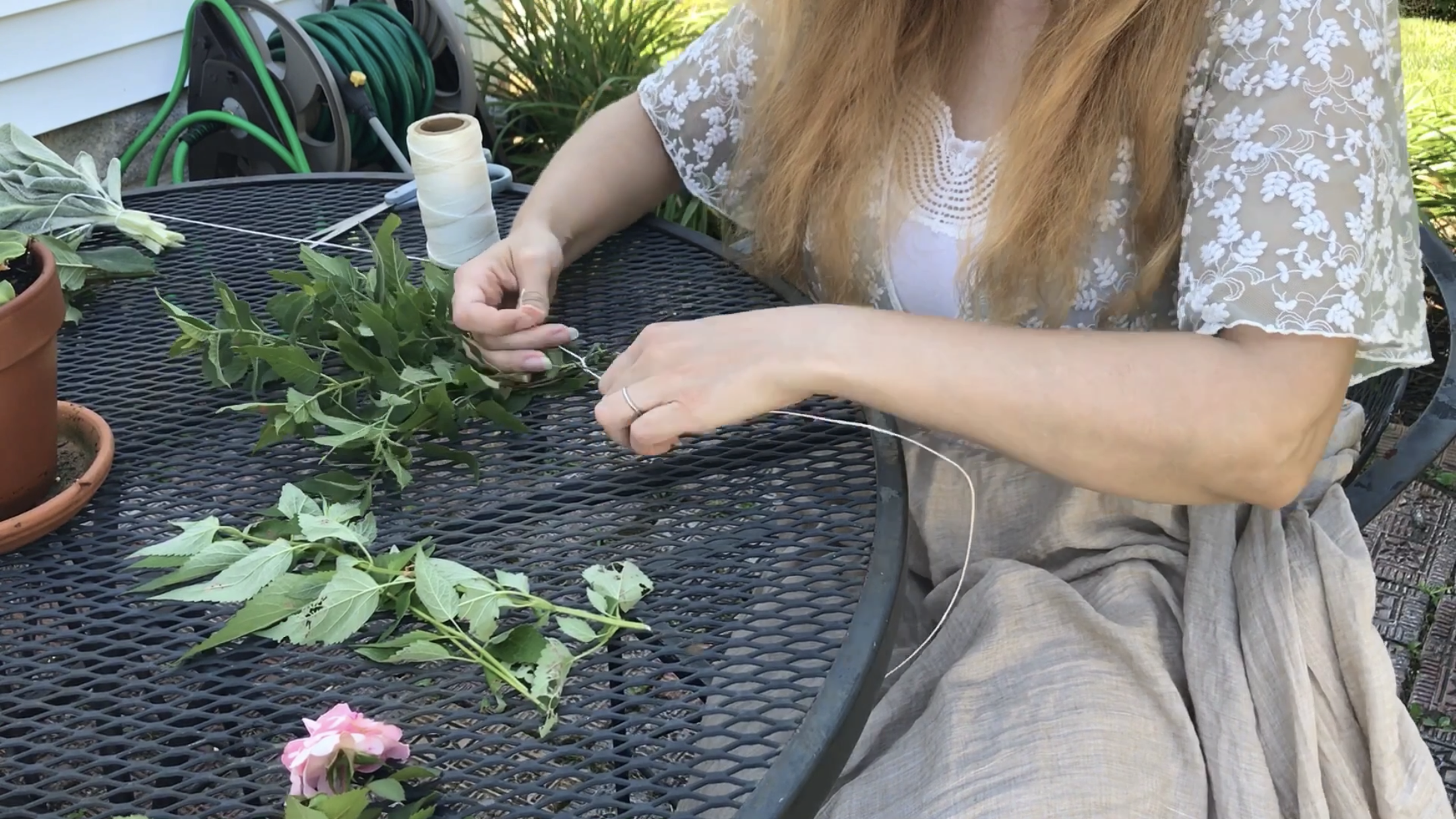 Next I collected my plants. I gathered lemon balm and calendula from my partial shade garden, and roses…this is an example of something I wanted in my bundles even though the roses I grow aren’t really aromatic.