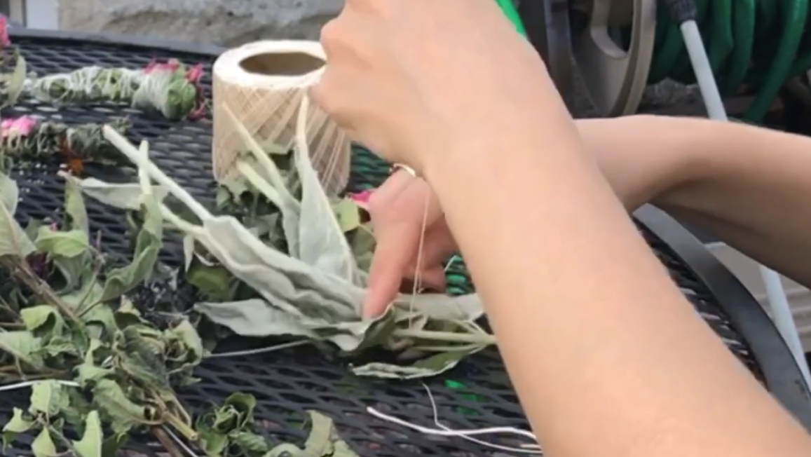 Once you’re satisfied with your bundle, wrap your string back down to the end of the bundle with the “tail” and tie a knot using your wrapping string and the tail. Cut off your string from the spool, but make sure you leave a second tail on your bundle. This is what you will use to hang your bundles to dry, long-term.